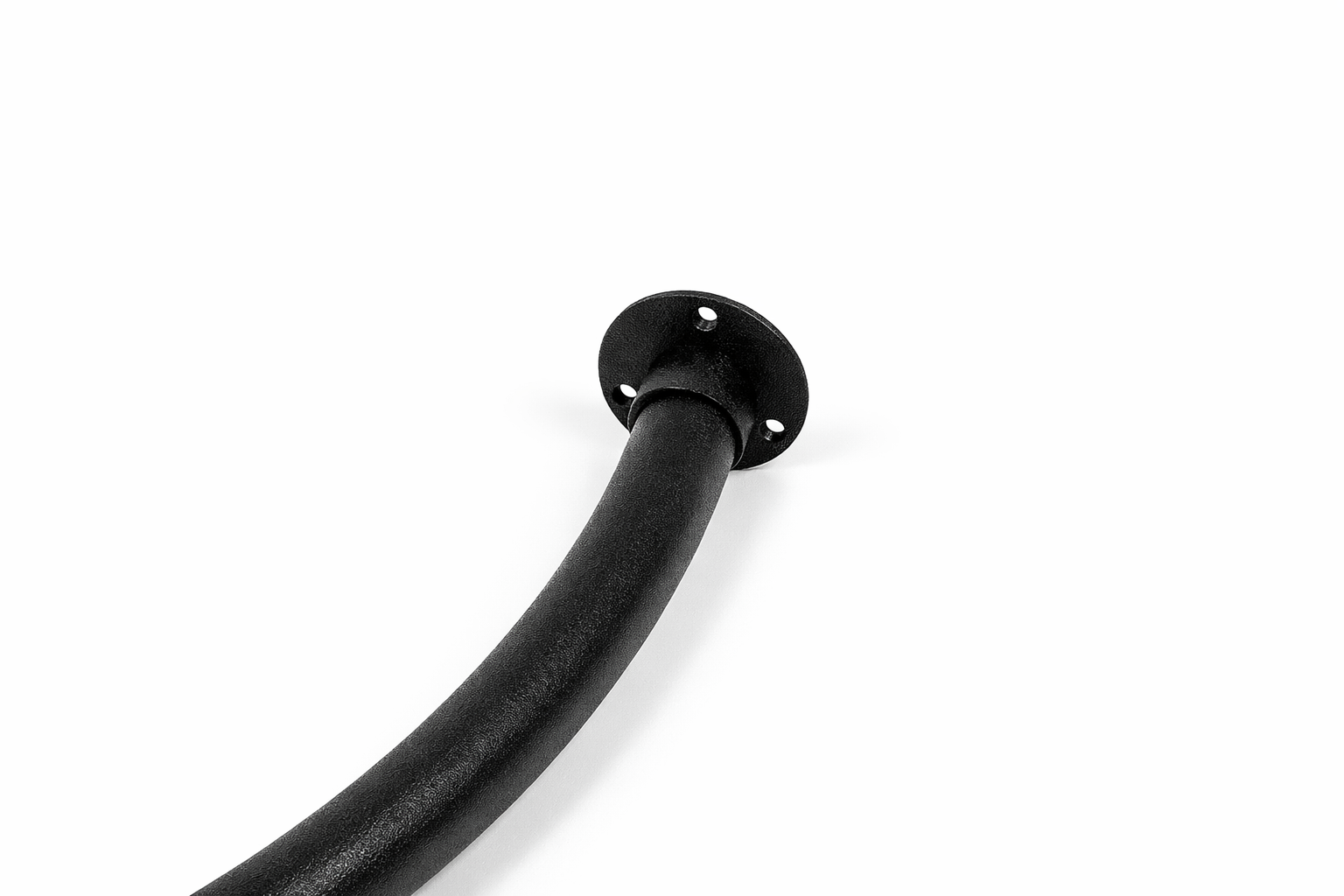 De garderobestang gebogen 90 graden zwart fijnstructuur is gemaakt uit staal. De buis heeft een diameter is Ø26,9 mm. De wanddikte is 1.5 mm. U koopt een hele stevige buis. De poedercoating is professioneel hoogwaardig. In een stoere kleur zwart. De afwerking is fijnstructuur. De lengte van de gebogen kledingstang is 74 cm (740 mm). Gemonteerd komt de gebogen garderobestang, in het midden, 52 cm (520 mm) uit de muur. Daarbij gemeten vanuit het midden naar de hoek. De buissteunen / rozetten worden vast gelast aan de buis. Daarna als geheel voorzien van de poedercoating. Dat geeft een mooi egaal resultaat. De montageplaatjes van de buissteunen hebben een diameter van Ø65 mm. Montage gebeurd door middel van 3 schroeven in verzonken schroefgaten.